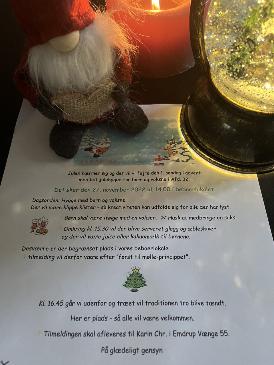 1. søndag i advent er der julehygge for børn og voksne i afd. 32. Der vil være klippe klister, julemusik, juice, kakaomælk, gløgg og æbleskiver, samt traditionen tro bliver juletræet tændt.
