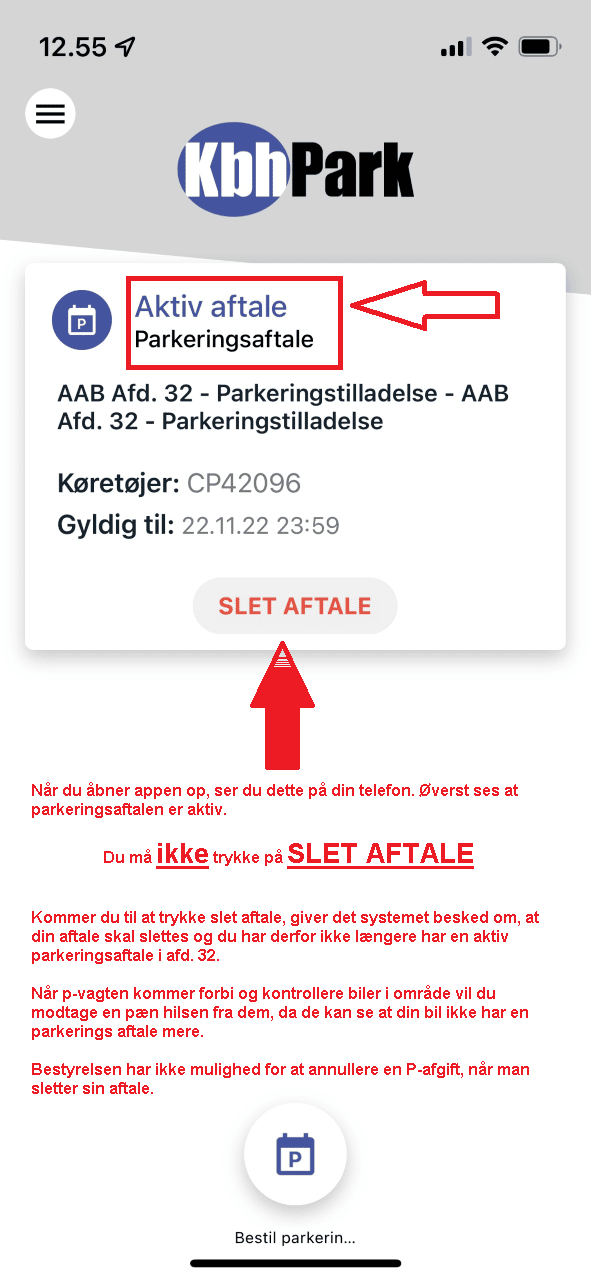 Når du åbner appen op, ser du dette på din telefon. Øverst ses at parkeringsaftalen er aktiv.